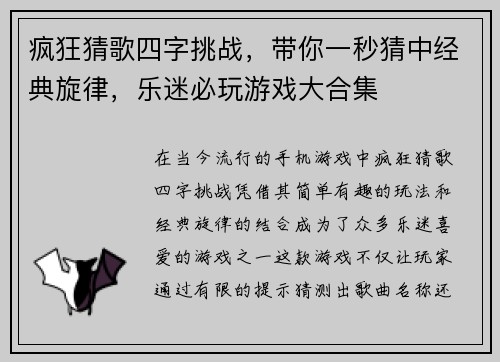 在当今流行的手机游戏中,《疯狂猜歌四字挑战》凭借其简单有趣的玩法和经典旋律的结合,成为了众多乐迷喜爱的游戏之一。这款游戏不仅让玩家通过有限的提示猜测出歌曲名称,还能够通过各种方式激发玩家对音乐的兴趣与回忆。无论是老歌、经典还是当前的热门歌曲,都能在游戏中找到身影,带给玩家一场耳朵与记忆的双重盛宴。本文将从四个方面详细探讨《疯狂猜歌四字挑战》这款游戏,具体分析其玩法机制、音乐多样性、挑战性以及社交互动四个方面,帮助玩家全面了解这款游戏的独特魅力。通过这篇文章,希望能够为更多乐迷提供一个有趣的游戏体验推荐,同时也为那些尚未接触过此类游戏的用户提供一些参考。